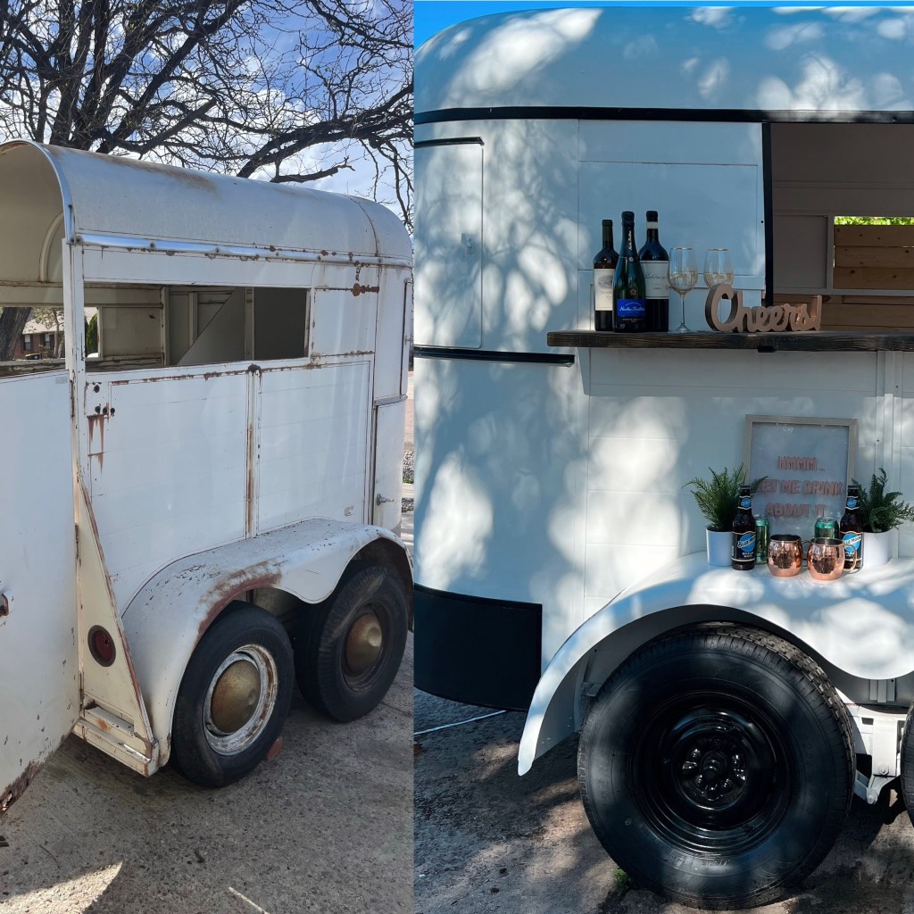 She is all about renovating and reusing so she asked for this old horse trailer that had been used by the horse women in our family. This 1971 trailer needed a lot of lovin’, but after some paint and new tires and a few other touches, it is ready to supply beverages for any event.
